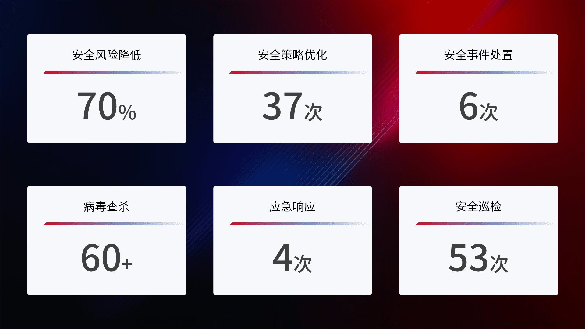 综合报告与文档服务: 定期提供安全事件处置报告、、、周/季度总结报告和年度总结报告;详尽的文档服务可帮助客户了解网络安全状况,,,,支持决策制定和流程优化。。。